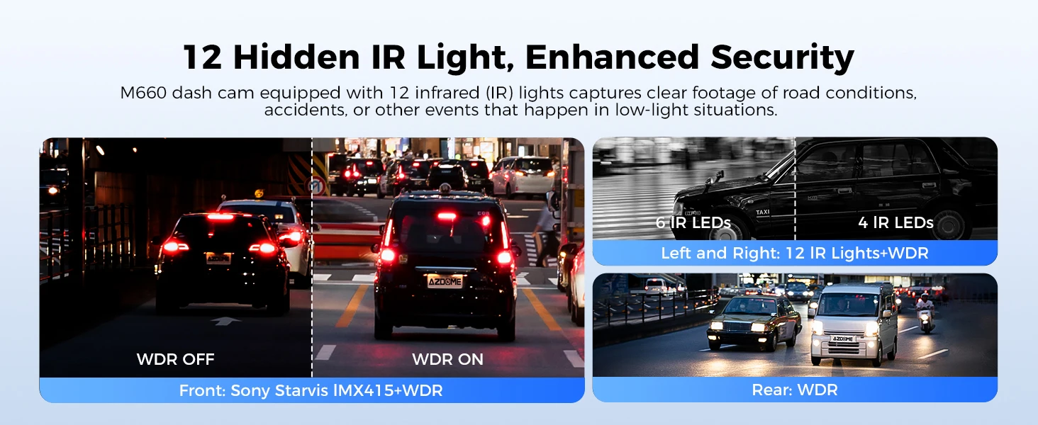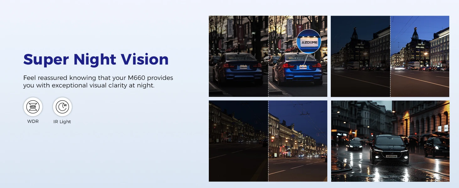 Equipped with advanced WDR Super Night Vision and infrared lighting, this car DVR ensures outstanding visibility in low-light conditions, making it an ideal companion for night drives so you never miss a crucial moment.