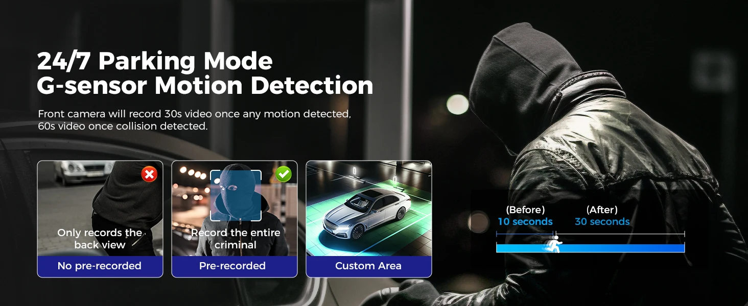 When the vehicle is turned off, it will automatically enter time-lapse 1fps recording mode. If the impact reaches the set G-sensor level, the camera will record a 1-minute video, lock and save it, then return to time-lapse 1fps recording.