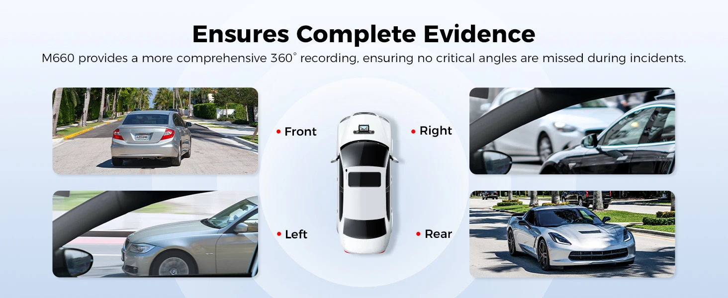 Capture every detail of your journeys with the AZDOME M660 Dash Cam’s exceptional 360° Full HD video quality, providing you with enhanced safety and reliable evidence collection in any driving scenario.